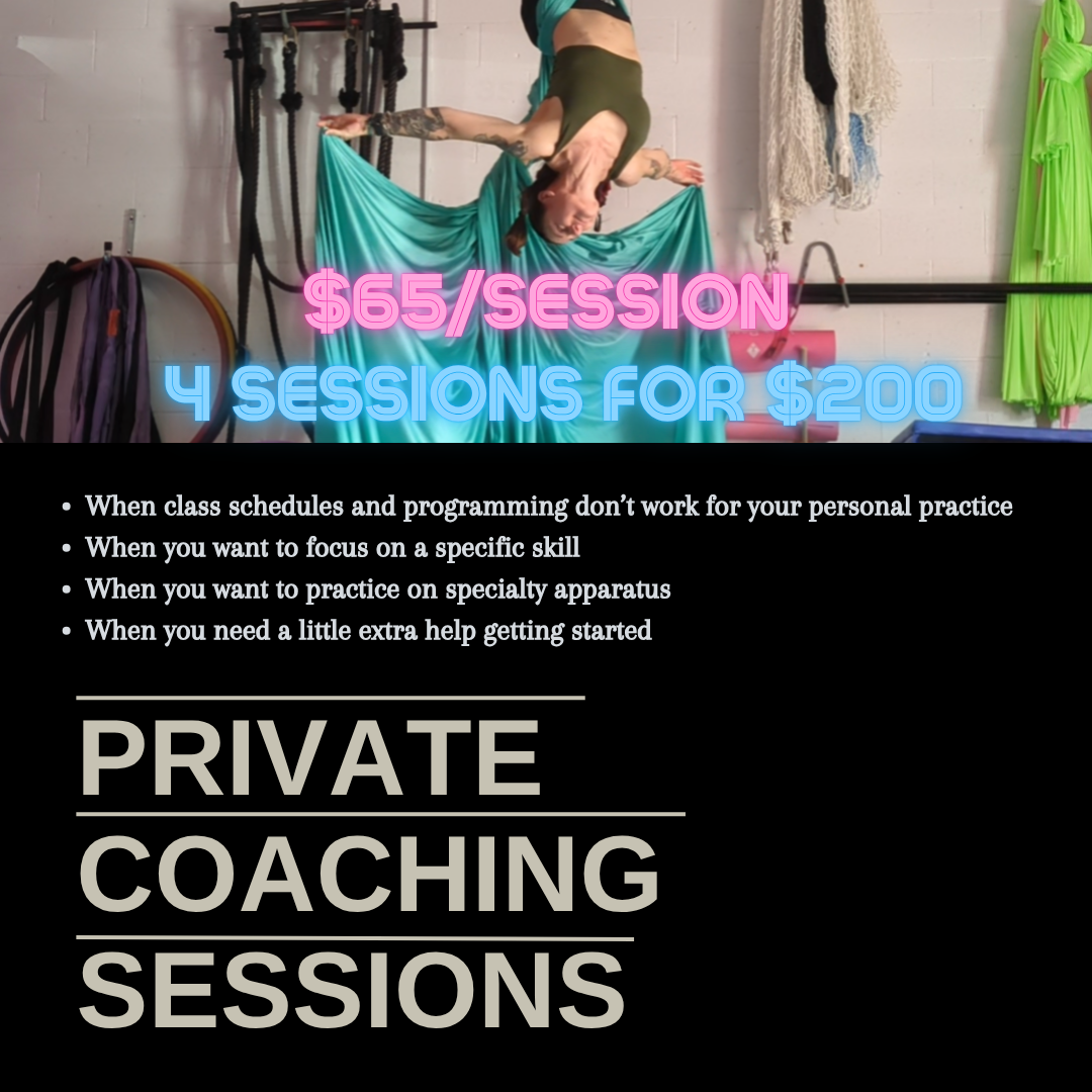 Begin your aerial practice with a private session on silks or lyra. Want to try something new or an apparatus that doesn’t have a weekly class schedule? Set up your private session today!