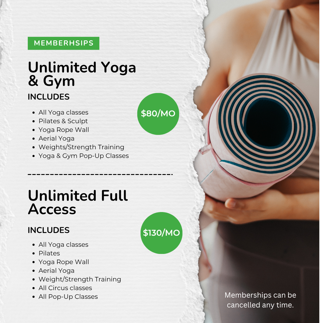 Class packages are available to purchase for Yoga and Circus Classes. Circus and Yoga packages are sold separately. All class packages expire one year after purchase date.